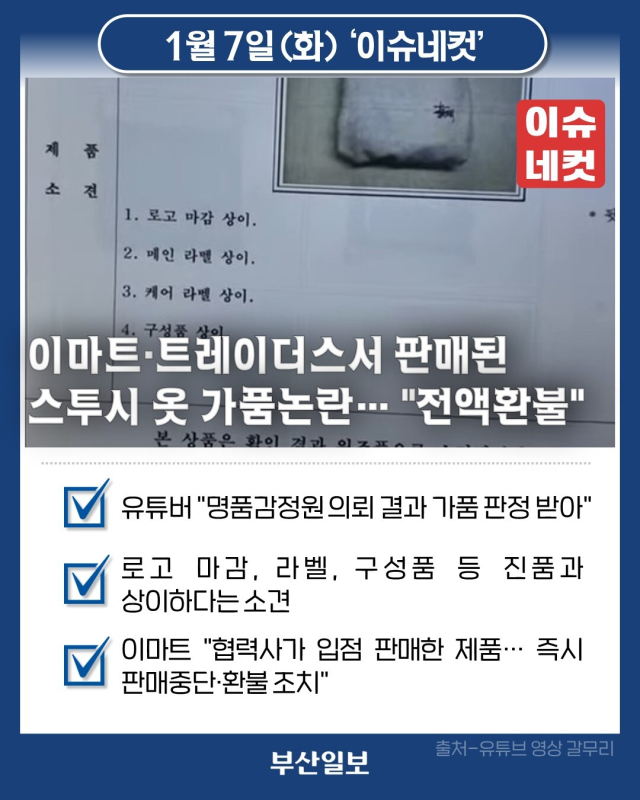협력업체가 행사 공간에서 판매한 스투시 맨투맨이 가품 논란에 휘말리자 이마트와 트레이더스가 환불 조치에 나섰습니다. 앞서 한 유튜버는 트레이더스에서 구매한 스투시 맨투맨 가격이 정품 대비 너무 저렴하다고 보고 명품감정원과 중고품 거래 플랫폼에 감정을 의뢰한 결과 가품 판정을 받았다는 내용의 동영상을 업로드 했습니다. 감정원은 해당 제품에 대해 로고 마감, 라벨, 구성품 등이 진품과 상이하다는 소견을 냈습니다. 온라인 커뮤니티 등에서 화제가 되자 이마트 측은 "가품 논란으로 문제가 된 해당 상품은 매장 내외의 행사 공간에 협력사가 입점해 판매한 상품"이라며 "논란이 발생한 시점에 선제로 해당 상품 판매를 즉시 중단했고 환불을 원하는 고객을 대상으로 전액 환불 절차를 신속히 진행 중"이라고 밝혔습니다. 또 "검증 결과에 따라 적절한 후속 조치를 성실히 수행할 예정"이라며 "이번 일을 계기로 협력업체 행사 상품에 대해서도 품질 관리 및 검수 체계를 더욱 강화하겠다"고 전했습니다.