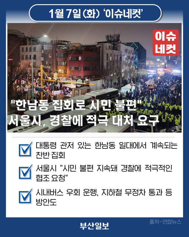 윤석열 대통령에 대한 체포 영장 발부 이후 대통령 관저가 있는 한남동 일대에서 찬반 집회가 이어지며 시민 불편이 커지자 서울시가 경찰에 적극적인 협조를 요청하는 등 대응에 나섰습니다. 7일 서울시는 보도자료를 통해 "최근 한남로 등 불법적인 도로 점거로 인해 시민들의 불편이 지속됨에 따라, 시민을 보호하고 교통 불편을 최소화하기 위해 경찰에 적극적인 협조를 요청하고 서울시 자체적으로 가동 가능한 모든 방안을 강구해 조치를 취할 계획"이라고 밝혔습니다. 전날에는 단속 주체인 용산경찰서에 공문을 발송하고 당초 신고된 범위를 벗어나는 철야 시위, 도로 전체 점거 등 행위에 대해 집회 시간 준수 등 적극적인 대처를 요구했습니다. 시는 교통방해 행위가 지속될 경우 관련 단체를 수사기관에 고발할 방침입니다. 뿐만 아니라 경찰청, 교통 운영 기관 등과 협조해 시내버스 우회 운행, 지하철 탄력적 무정차 통과, 교통 정보 제공 등의 조치 등 가동할 수 있는 모든 방안을 강구해 현장 대응을 이어 나가겠다고 밝혔습니다.