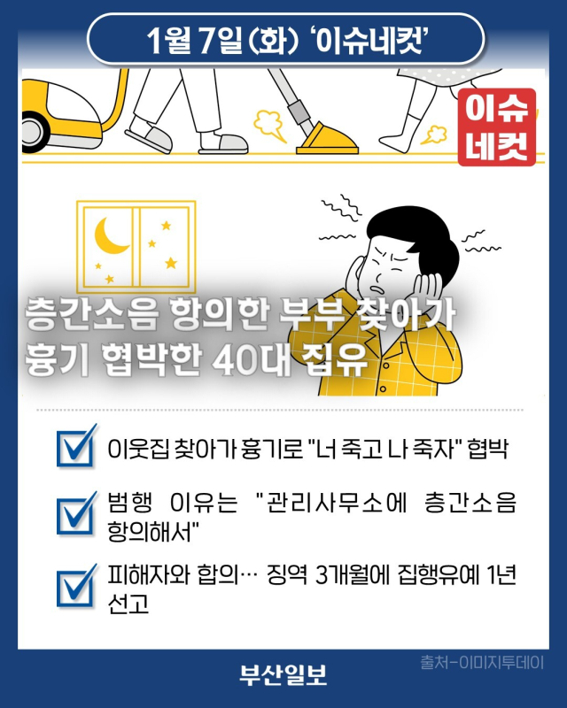 층간소음으로 아파트 관리사무소에 항의한 이웃 부부의 집에 흉기를 들고 찾아가 협박한 40대 여성이 징역형 집행유예를 선고받았습니다. 7일 인천지법 형사14단독은 특수협박 혐의로 기소된 A(45·여) 씨에게 징역 3개월에 집행유예 1년을 선고했다고 밝혔습니다. A 씨는 지난해 1월 29일 오후 10시 45분께 인천시 서구 아파트에서 B(40) 씨와 그의 아내 C(39) 씨를 흉기로 협박한 혐의를 받습니다. A 씨는 집에서 흉기를 들고나와 B씨 부부의 집 현관문을 발로 걷어차면서 "나와라"며 "너를 죽이고 나도 죽는다"고 소리친 것으로 알려졌습니다. 그는 이웃집에 사는 B 씨 부부가 '층간소음이 심하다'며 관리사무소에 항의한 사실을 알게 되자 화가 나 범행한 것으로 조사됐습니다. 재판부는 "협박 정도가 가볍지 않다"면서도 "피해자와 합의했고 초범인 점 등을 고려했다"고 양형 이유를 밝혔습니다