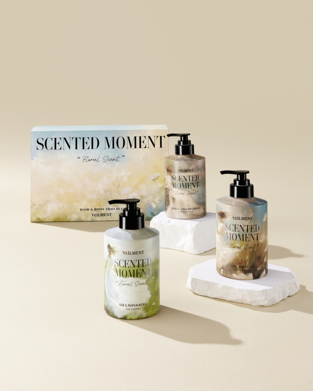 우선 센티드 모먼트 ‘플로럴 세트’는 욕실을 마치 미술관처럼 꾸미고 싶은 고객에게 추천하고 싶은 제품이다. 샴푸 415 ml와 컨디셔너 415 ml, 바디워시 415ml로 구성했다. 특히 바람에 날리는 플로럴(꽃) 향기를 담은 센티드 모먼트 라인의 콘셉트를 그대로 구현해낸 클래식한 패키지 디자인이 돋보인다.