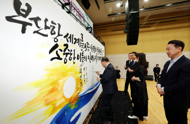 7일 부산항국제여객터미널 이벤트홀에서 열린 ‘2025 부산항 안전기원제’에서 부산항의 안전을 바라는 캘리그래피 퍼포먼스가 진행되고 있다. 정종회 기자 jjh@