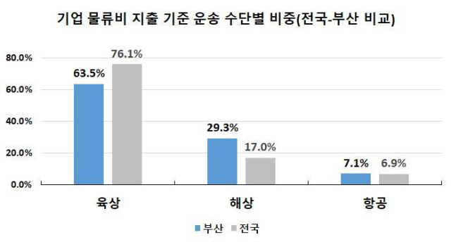 조사결과에 따르면 응답 기업의 32.4%는 매출액 대비 물류비 비중이 10%를 넘긴 것으로 나타났다. 물류비 지출을 기준으로 한 운송 수단의 경우 부산의 육상 운송 비중(63.5%)은 전국(76.1%)보다 다소 낮은 반면 해상 운송(29.3%)은 전국(17.0%)보다 월등히 높은 수준을 보였다. 전년도와 비교했을 때 해상 물류비 부담이 늘었다고 응답한 기업 비율 역시 전체의 35.3%로, 부담이 줄었다(5.5%)는 비율을 크게 앞섰다. 특히 전체 물류비에서 해상 운송 차지 비중이 50%를 넘는 수출 기업의 경우에는 부담이 늘었다는 비중이 48.2%에 달하는 것으로 조사됐다. 해상운임 급등으로 인한 물류비 이슈에 지역 기업이 더 큰 영향을 받는 것이 수치로 확인된 셈이다.