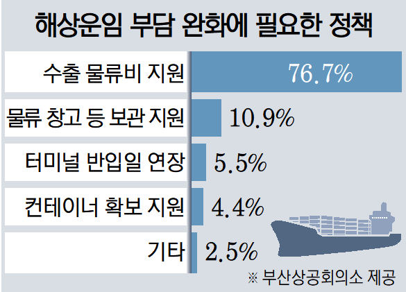 응답 기업들의 76.7%는 해상운임 부담 완화를 위해 가장 필요한 지원 방안으로 직접적인 수출 물류비 지원을 1순위로 꼽았다. 물류 창고 등 보관 지원(10.9%), 터미널 반입일 연장(5.5%), 컨테이너 확보 지원(4.4%) 등도 필요 지원 방안에 순위를 올렸다.