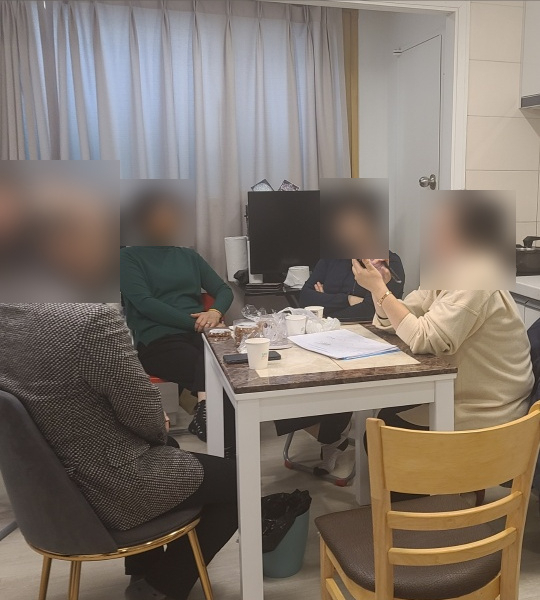 2022년 1월 피해자들을 불러 모아 파워볼 게임에 대해 설명하는 모집책 B(맨오른쪽) 씨. 부산경찰청 제공