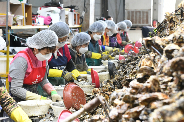 굴 박신장(굴까기 가공공장)에서 작업자들이 칼로 굴 껍데기를 제거하는 작업을 하고 있다. 해수부 제공