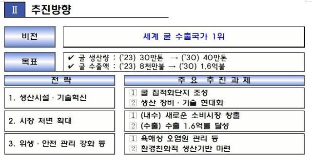 ‘굴 양식산업 발전방안’은 ‘세계 굴 수출국가 1위 달성’이란 비전 아래 ‘2030년까지 굴 생산량 10만t(톤)증산(2023 년 30만t→2030년 40만t)’, ‘2030년까지 굴 수출액 2배(2023년 8000만 달러→2030년 1억 6000만 달러)’라는 목표 달성을 위한 △생산시설·기술 혁신 △시장 저변 확대 △위생·안전관리 강화 등 세 가지 전략을 담고 있다.