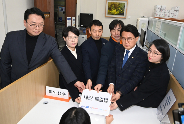 야6당 의원들이 9일 오전 서울 여의도 국회 의안과에서 내란 특검법을 제출하고 있다. 왼쪽부터 개혁신당 천하람 원내대표, 진보당 전종덕 의원, 더불어민주당 김용민 원내정책수석부대표, 사회민주당 한창민 대표, 조국혁신당 황운하 원내대표, 기본소득당 용혜인 대표. 연합뉴스