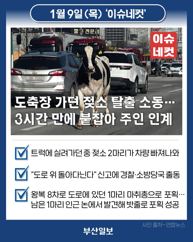 9일 오전 9시 20분께 경기도 평택시 장당동 일대에서 트럭에 실려 도축장으로 향하던 젖소 2마리가 차량을 빠져나와 약 3시간 동안 길거리를 돌아다니는 소동이 벌어졌습니다. 당시 "젖소가 도로 위를 돌아다닌다"는 신고에 출동한 경찰과 소방당국은 왕복 8차로 대로 위를 돌아다니는 젖소 1마리를 발견해 도로 바깥쪽으로 유도한 뒤 마취총으로 포획했습니다. 이어 인근 논에서 남은 젖소 1마리도 추가로 발견해 밧줄 등으로 포획했고, 소유주를 확인해 오후 1시 20분께 포획한 젖소들을 모두 인계 조치했습니다. 경찰 관계자는 "젖소의 탈출 및 포획 과정에서 통행 차량 및 시민 피해는 발생하지 않았다"고 밝혔습니다.