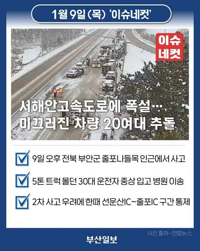 9일 오후 3시 30분께 전북 부안군 줄포면 서해안고속도로 서울 방향 줄포나들목 인근에서 차량 20여대가 부딪히는 사고가 일어났습니다. 이 사고로 5톤 트럭을 몰았던 운전자 A(30대) 씨가 중상을 입고 의식이 흐릿한 상태로 병원으로 이송됐습니다. 전북 지역에 사흘 동안 많은 눈이 내린 가운데, 부안에도 이날 오전 8시 40분을 기해 대설경보가 내려진 상황이었는데요. 한국도로교통공사 측에서는 눈이 많이 내리는데다 사고 차량들이 뒤엉키면서 2차 사고가 우려되자, 사고가 일어난 선운산 IC∼줄포IC 구간을 통제하고 수습에 나섰습니다. 경찰 관계자는 "눈길에 미끄러져서 차량 여러 대가 부딪힌 것으로 보인다"고 밝혔습니다.
