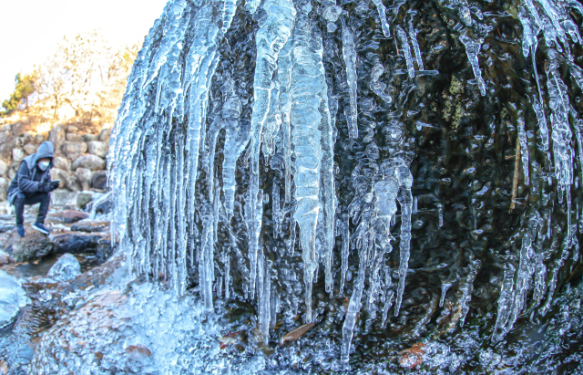 부산 지역 아침 최저기온이 영하 4.7도까지 떨어져 올겨울 최강 한파를 기록한 9일 오전 부산 북구 화명동 대천천에 커다란 고드름이 생겨 추위를 실감하게 하고 있다. 차가운 대륙성 고기압이 남하하면서 10일 아침 최저기온은 영하 9도로 예상된다.