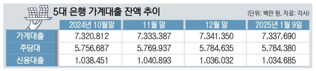 한편 5대 은행(KB국민·신한·하나·우리·NH농협)의 지난 9일 기준 가계대출 잔액은 733조 7690억 원으로, 작년 말(734조 1350억 원)보다 3660억 원 줄었다. 월말까지 약 20일 남았지만, 만약 역성장이 확정될 경우 2023년 3월(-2조 2238억 원) 이후 8개월 만의 첫 감소다. 시중은행 관계자는 “작년 말 이후 정치 혼란 등으로 경기 하강 우려가 커지면서 수도권에서조차 주택 거래가 눈에 띄게 줄고 가계대출 증가세도 크게 꺾이는 분위기”라며 “이런 상황에서는 언제라도 은행권에 가계대출 수요 확보를 위한 가산금리 인하 경쟁이 촉발될 가능성이 있다”고 말했다.