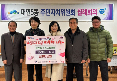 부산 남구 대연5동 주민자치위원회(위원장 윤명희)는 지난 8일에 이웃돕기 성금 100만원을 대연5동 행정복지센터에 전달했다.