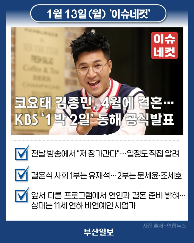 3인조 혼성 그룹 코요태 멤버이자 가수 겸 방송인으로 활동 중인 김종민(45)이 올해 4월 결혼식을 올립니다. 김종민은 12일 방송된 KBS 예능 프로그램 '1박2일'을 통해 "저 장가를 간다"며 올해 4월 20일 오후 6시 서울 모처에서 결혼한다고 구체적인 일정을 직접 알리고, 1부 사회는 유재석, 2부 사회는 문세윤, 조세호가 맡는다고 밝혔습니다. 김종민은 KBS 대표 예능인 '1박2일'에서 2007년 시즌1부터 원년 멤버로 출연하며 자리를 지켜온 가운데, 2016년 연말에는 KBS 연예대상을 수상한 바 있습니다. 김종민은 앞서 다른 프로그램을 통해서 결혼을 준비 중인 연인이 있다고 전했는데요. 상대는 11세 연하의 비연예인 사업가로 알려졌습니다.