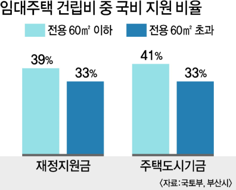 13일 국토교통부와 부산시에 따르면 임대주택의 전용면적이 60㎡를 넘어가면 정부가 임대주택 건립에 국비로 보조하는 지원금이 줄어든다. 임대주택을 지을 때 투입되는 국비 지원금은 재정지원금과 주택도시기금 융자 등 두 가지 형태로 구분된다.