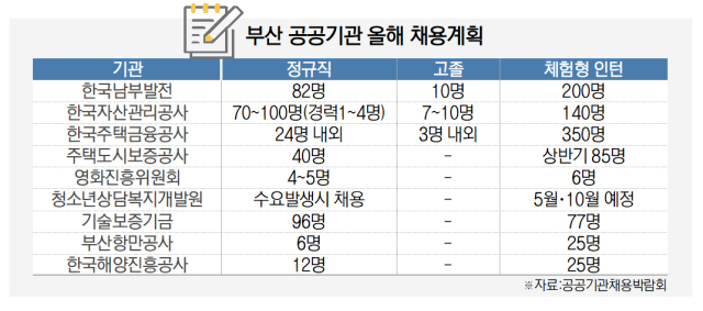 부산에 있는 중앙부처 소속 공공기관 중 한국남부발전은 올해 82명을 신규 채용하고 고졸 10명도 별도로 뽑는다. 주택도시보증공사(HUG)는 정규직 40명을, 한국자산관리공사(캠코)는 70~100명을 채용할 예정이다. 또 전국적으로 올해 공공기관은 2만 4000명 이상 채용할 계획이다.