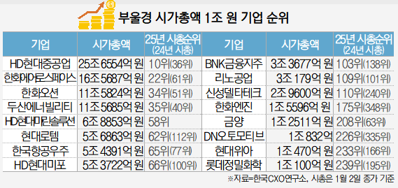 HD현대중공업(울산 동구)이 부울경 시총규모 1위로 전년 대비 14조 3812억 원이 커진 25조 6554억 원을 기록했다. 국내 시총 순위에서는 10위로 전년 대비 26계단이나 올랐다. 한화에어로스페이스(경남 창원시)는 시총이 16조 5687억 원으로 전년보다 39계단 상승한 22위에 올랐다. 한화오션(경남 거제시)과 두산에너빌리티(경남 창원시)는 각각 11조 5824억 원, 11조 5685억 원으로 34위, 35위를 기록했다.