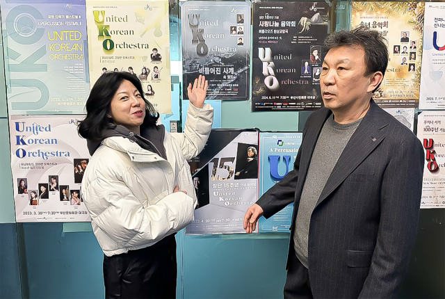 유나이티드 코리안 오케스트라 공연 포스터 앞에 선 단장 전영수(오른쪽)와 음악감독 최영화. 김은영 기자 key66@
