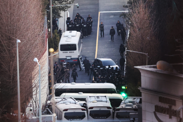 고위공직자범죄수사처(공수처)와 경찰이 윤석열 대통령에 대한 2차 체포영장 집행에 나선 15일 용산구 한남동 대통령 관저에서 경찰 병력이 입구를 지나 관저 방향으로 이동하고 있다. 연합뉴스