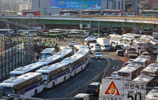 윤석열 대통령 2차 체포영장 집행이 실시된 15일 서울 용산구 한남동 대통령 관저 인근에 경찰버스 차량이 세워져 있다. 연합뉴스