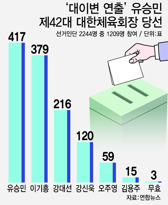 역대 대한체육회장 선거 중 후보(6명)와 선거인 수(2244명)가 가장 많았던 이번 선거는 ‘반(反) 이기흥’ 단일화 논의가 큰 진전을 보이지 못하면서 이 회장의 우세가 점쳐졌으나 유 당선인이 막판 대반전을 일궈냈다.