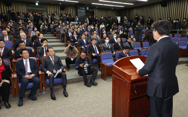 국민의힘 권성동 원내대표가 16일 국회에서 열린 비상의원총회에서 발언하고 있다. 연합뉴스