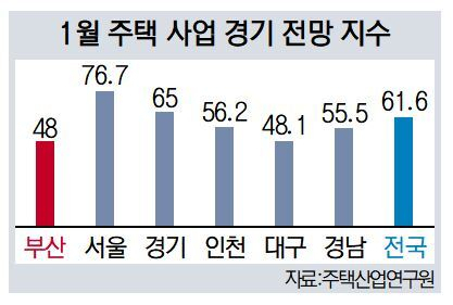 서울은 76.7로 16.3P 떨어졌고, 부산은 48로 22.8P나 하락했다. 부산은 전국 주요 시도 가운데 전망이 가장 나빴다. 주택산업연구원 관계자는 “정부의 강력한 대출 규제와 탄핵 정국 탓에 주택 사업 경기 전망이 부정적으로 나타났다”며 “특히 지방에서 매매가와 거래량이 둔화세를 보여 매수 심리가 크게 위축되고 있다”고 설명했다.