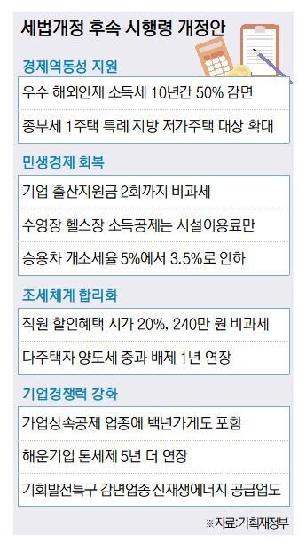 해외 인재 유치를 위해 글로벌 톱 100 공대 석·박사 출신 수석 엔지니어급 이상을 대상으로 하는 ‘K테크 패스’ 소지자에게는 10년간 소득세를 50% 감면해준다. 지역균형발전을 지원하기 위해 기회발전특구 창업기업의 소득세·법인세 감면 업종도 확대한다. 천연가스 공급업, 수소 등 신재생 에너지 공급업 등이 추가됐다. 정부는 이번 시행령 개정으로 인한 세금 감소효과를 3000억 원 정도로 추산했다. 대부분이 승용차 개별소비세 세율 인하에서 발생한다.