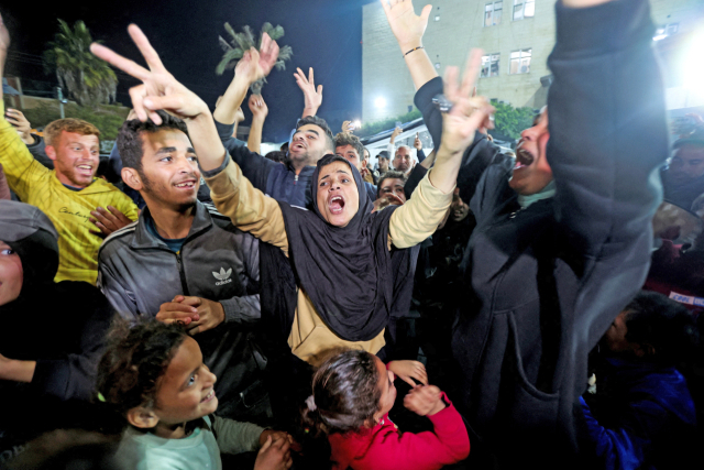 이스라엘군과 팔레스타인 무장정파 하마스가 가자전쟁 휴전을 결단한 15일(현지 시간) 가자 지구 중부 데이르 알발라에서 휴전 소식을 전해 들은 시민들이 환호하고 있다. 로이터연합뉴스