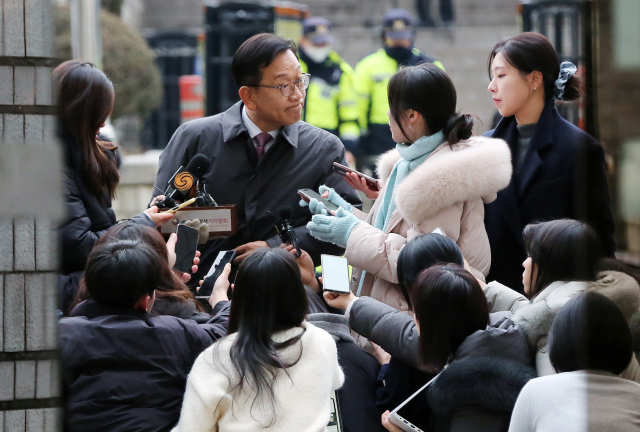 윤석열 대통령이 체포적부심사에 불출석한 16일 오후 서울 서초구 중앙지방법원에서 윤석열 대통령 측 석동현 변호사가 취재진의 질문에 답하고 있다. 연합뉴스