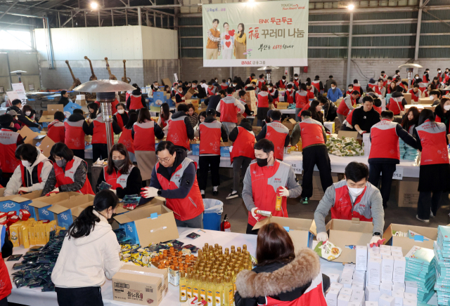 BNK금융그룹 전 계열사 임직원들이 18일 부산 중구 부산항 북항 제1부두 창고에서 ‘BNK사회공헌의 날 - 설맞이 복꾸러미 나눔 행사’를 갖고 취약계층에 전달할 복꾸러미를 만들고 있다.