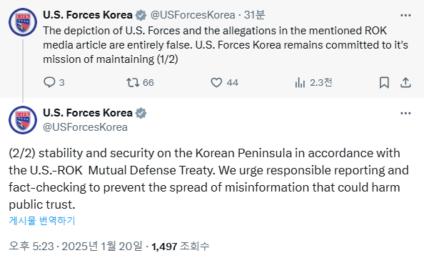 20일 연합뉴스 등에 따르면 주한미군은 이들 보도에 대한 문의에 입장문을 내고 "한국 매체 기사에 언급된 미군에 대한 기술과 주장은 완전히 거짓"이라고 밝혔다. 그러면서 "주한미군은 한미상호방위조약에 따라 한반도의 안정과 안보를 유지하는 임무에 전념하고 있다"며 "국민의 신뢰를 해칠 수 있는 잘못된 정보의 확산을 막기 위해 책임 있는 보도와 사실 확인을 촉구한다"고 강조했다. 해당 입장문은 주한미군(U.S. Forces Korea) 공식 엑스(옛 트위터)에도 게재됐다.