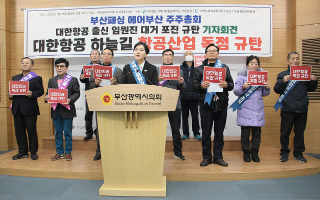 시민공감, 가덕도허브공항시민추진단 등 부산시민단체는 20일 부산시의회에서 기자회견을 열고 “부산과 논의 없이 에어부산 임원진을 대한항공 출신으로 채운 것은 해외승인 이후 에어부산 분리매각을 논의하자는 당초 입장에 위배된다”며 임원진 선임 전원 사퇴를 촉구했다. 이들은 또 지역 거점 항공사 확보를 위한 에어부산 분리매각을 재차 요구했다. 시민공감 제공