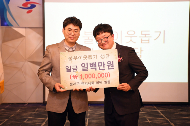 부산 동래구 한의사회(회장 이수칠)는 지난 14일 정기총회에서 동래구(구청장 장준용)에 이웃돕기 성금 100만 원을 기탁했다.