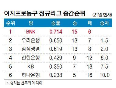 부산 BNK는 지난 19일 용인 삼성생명에 61-65로 패해 21일 현재 15승 6패를 기록하고 있다. 2위 우리은행은 13승 7패, 3위 삼성생명은 13승 8패로 1위 BNK를 각각 1.5경기와 2경기 차로 바짝 추격하고 있다.
