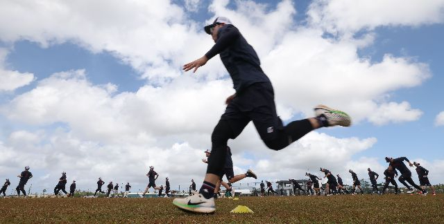 지난해 스프링캠프 때 롯데 자이언츠 선수들이 미국 괌 데데도스포츠콤프렉스 구장에서 몸을 풀고 있는 모습. 부산일보DB