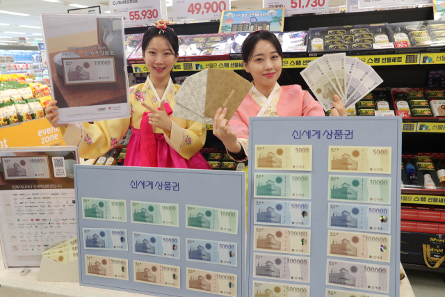 이마트가 설 명절을 앞두고 세뱃돈으로 제격인 신세계상품권 판매에 나섰다. 전국 이마트 및 트레이더스 매장에서 구매할 수 있으며, 5000원부터 50만 원까지 다양한 금액대의 상품권이 준비돼 있다. 22일 오전 이마트 용산점에서 모델들이 신세계상품권을 소개하는 모습. 이마트 제공