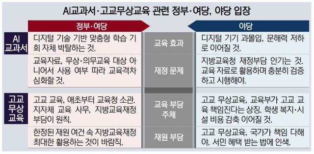 AI 교과서의 경우 야권에서 교과서가 아닌 교육자료로 본다는 ‘초중등교육법’ 개정안을 밀어붙이자 정부·여당은 ‘균등한 교육 기회 훼손”이라며 맞서고 있다. 정치권은 고교 무상교육 예산 문제를 놓고도 서로 “지자체 부담”(정부·여당) “정부 부담”(야권) 등으로 첨예하게 대립하면서 관련 법 개정을 둘러싼 갈등을 벌이고 있다.