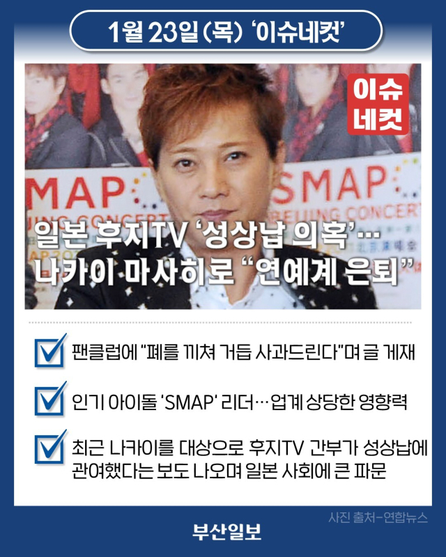 1. 일본 후지TV ‘성상납 의혹’…나카이 마사히로 “연예계 은퇴”
