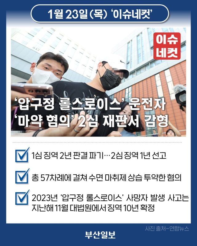 2023년 8월에 일어난 이른바 '압구정 롤스로이스' 교통사고 가해자 B 씨가 마약류 상습 투약 혐의로 별도 기소된 사건의 2심에서 일부 감형됐습니다. 앞서 1심은 B 씨에게 징역 2년을 선고했지만, 2심 재판부는 "범행을 인정하고 반성하고 있으며 판결이 확정된 죄와 동시에 재판받았을 때와 비교해 형평성을 고려해 원심 형을 낮춘다"고 설명했습니다. B 씨는 총 57차례에 걸쳐 각종 수면 마취제를 상습 투약하고 그 과정에서 타인의 명의를 도용한 혐의를 받는데요. 그는 2023년 8월 서울 강남구 신사동 압구정역 인근 도로에서 롤스로이스 차량을 운전하다가 인도로 돌진해 행인(당시 27세)을 다치게 하고, 결국 사망케 한 혐의로 기소돼 지난해 11월 대법원에서 징역 10년이 확정됐습니다.