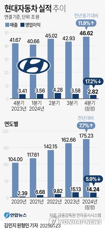 현대차는 23일 경영실적 컨퍼런스콜에서 지난해 연결 기준 영업이익이 14조 2396억 원으로 전년보다 5.9% 감소한 것으로 잠정 집계됐다고 밝혔다. 매출은 전년 대비 7.7% 증가한 175조 2312억 원을 기록하며 역대 최대를 나타냈다. 당기순이익도 13조 2299억 원으로 7.8% 늘었다.