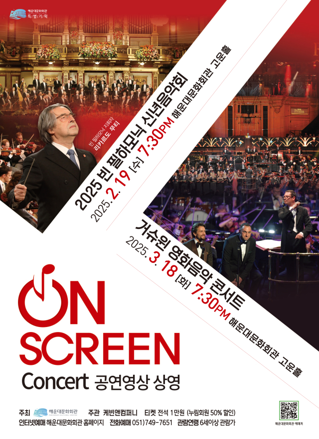 유럽 현지 공연을 생생하게 전달할 해운대문화회관의 실황 공연 상영회 ‘On Sreen Concert’ 첫 순서는 2025년 1월 1일 빈 필하모닉 신년 음악회(지휘 리카르도 무티)이다. 프로그램은 요한 슈트라우스 1세 ‘자유 행진곡’, 요한 슈트라우스 2세의 ‘아름답고 푸른 도나우’ 왈츠 등이다. ▶2월 19일(수) 오후 7시 30분 해운대문화회관 고운홀. 전석 5000원.