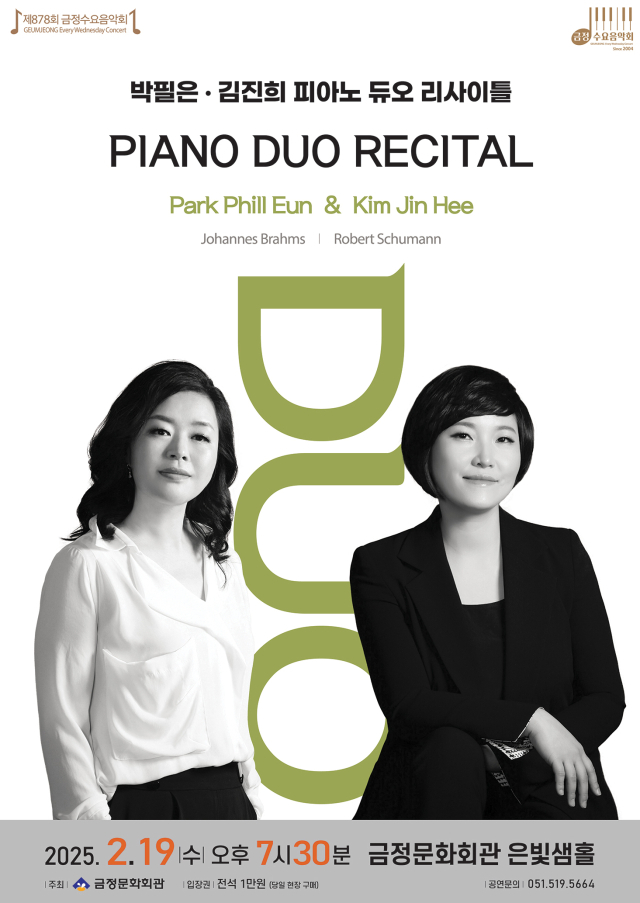 제878회 금정수요음악회는 피아노 듀오 리사이틀이다. 연주자는 부산대와 독일 프라이부르크 국립음대 피아노 실내악 석사 과정, 뮌스터 국립음대 전문 연주자 과정, 뒤셀도르프 국립음대 최고 연주자 과정을 졸업한 박필은과 부산대 학사와 석사를 졸업하고 독일 뒤셀도르프 국립음대 전문 연주자 과정과 최고 연주자 과정, 네덜란드 마스트리흐트 국립음대 최고 연주자 과정을 졸업한 김진희이다. 두 사람은 브람스(피아노 5중주 바단조 작품번호 34)와 슈만(피아노 5중주 내림마장조 작품번호 44)의 피아노 5중주를 네 손을 위한 피아노 듀오로 들려준다. ▶2월 19일(수) 오후 7시 30분 금정문화회관 은빛샘홀. 입장료 1만 원.