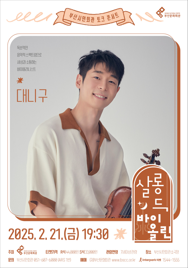 대중의 관심을 한 몸에 받는 바이올리니스트를 초청해 부산시민회관이 2회에 걸쳐 마련하는 토크 콘서트 ‘살롱 드 바이올린’ 첫 주자는 대니 구가 나선다. “클래식을 알리고, 대중화 다리를 놓는 게 내 역할”이라고 말하는 대니 구는 2016년 앙상블 디토 공연으로 국내 무대에 데뷔한 이래 정통 클래식뿐 아니라 재즈, 팝 등 다양한 무대에서 장르의 경계를 허무는 행보를 보여 왔다. 또한 클래식 아티스트로선 드물게 ‘나 혼자 산다’(MBC) 프로그램에 출연하며 대중적인 인지도를 높였다. 이번 무대에서는 대니 구의 삶과 함께해 온 바이올린에 대한 진솔한 이야기를 들려준다. ▶2월 21일(금) 오후 7시 30분 부산시민회관 소극장. 관람 대상 7세 이상. 입장료 R석 4만 4000원, S석 3만 3000원.