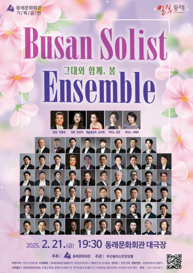 남성 전문 성악가 60여 명이 모인 ‘부산 솔리스트 앙상블’(회장 이홍득)이 펼치는 ‘그대와 함께, 봄’ 동래문화회관 기획 공연. 오페라, 뮤지컬, 가요에 이르는 다양한 장르의 합창을 선보인다. 지휘 최진아, 예술총감독 김지혜, 피아노 김란·서혜리. ▶2월 21일(금) 오후 7시 30분 동래문화회관 대극장. 입장료 2만 원. 초등학생 이상 관람.