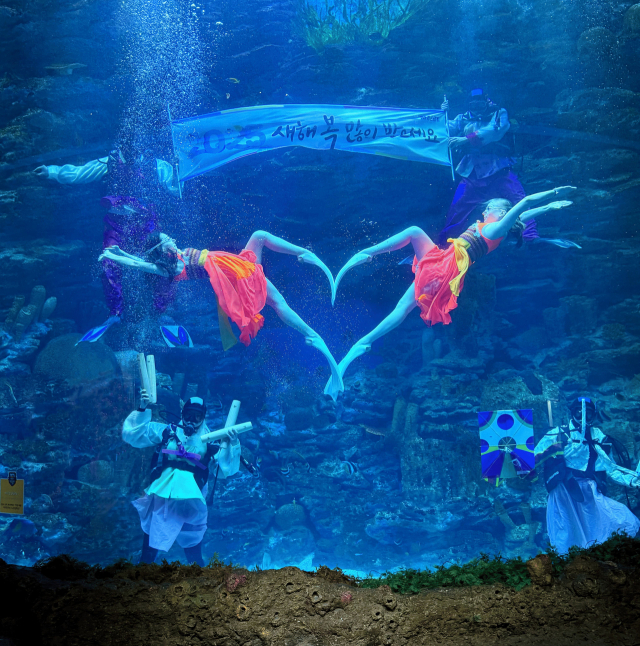 부산아쿠아리움 수조에서 한복 등을 입은 아쿠아리스트들이 설날 맞이 이색 공연을 펼치고 있다. 씨라이프부산 제공