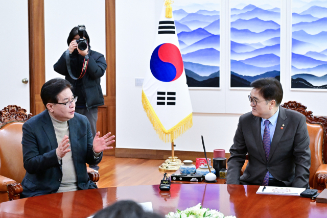 시도의회의장협의회 회장인 안성민(왼쪽) 부산시의장이 23일 국회 의장실에서 우원식 국회의장과 간담회를 하고 있다. 부산시의회 제공