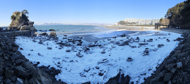 역대급 한파가 찾아온 10일 부산 다대포해수욕장에 밀물로 들어온 바닷물이 강추위로 꽁꽁 얼어붙어 눈이 내린 듯하다. 이날 부산지역 최저기온이 영하 10.1도까지 떨어지고 강풍까지 불어 체감온도는 이보다 더 낮았다. 연합뉴스