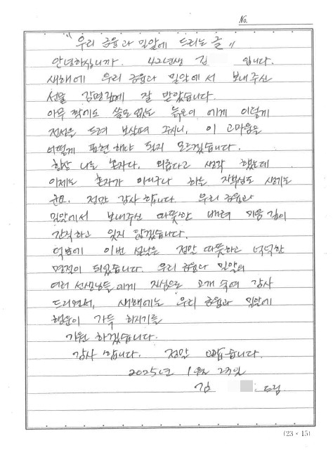 김 씨는 ‘외롭다고 생각했는데 이제는 혼자가 아니구나 하는 자부심도 생기는군요’라며 기념 선물을 지원한 것에 대해 “여러 선생님에게 진심으로 고개 숙여 감사드리면서, 새해에는 행운이 가득하시길 기원하겠습니다”고 편지를 마무리했다.