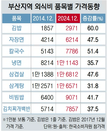 30일 한국소비자원 참가격에 따르면 지난해 12월 기준 부산지역 8개 주요 외식 메뉴(김밥, 자장면, 칼국수, 냉면, 삼겹살, 삼계탕, 비빔밥, 김치찌개)의 가격(이하 1인분 보통 기준, 김밥은 1줄 기준) 10년 전인 2014년 12월 대비 평균 44.2% 올랐다. 다만, 김밥은 기존 1인분에서 2017년 1월부터 1줄 기준으로 단위가 바뀌었으므로 2017년 12월 가격을 비교가격으로 반영했다.