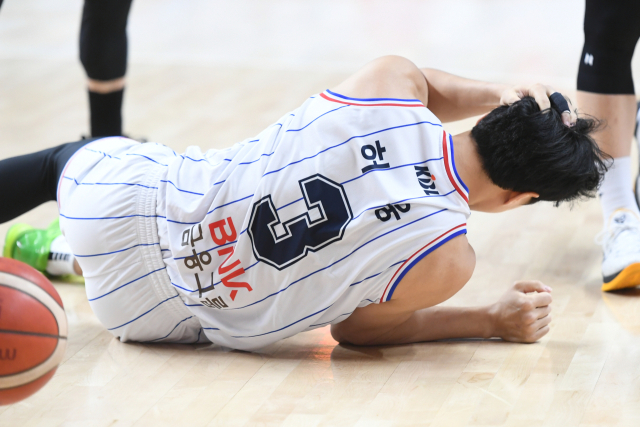 부산 KCC의 해결사 허웅이 30일 울산동천체육관에서 열린 2024-2025 KCC 프로농구 울산 현대모비스와 경기에서 코트에 쓰러져 있다. 부산 KCC는 이날 울산 현대모비스에 80-97로 패해 시즌 첫 4연승 달성에 실패했다. 하지만 리그 7위 KCC는 15승 18패를 기록하며 6위 원주 DB(16승 18패)를 반 경기 차로 바짝 추격했다. KBL 제공
